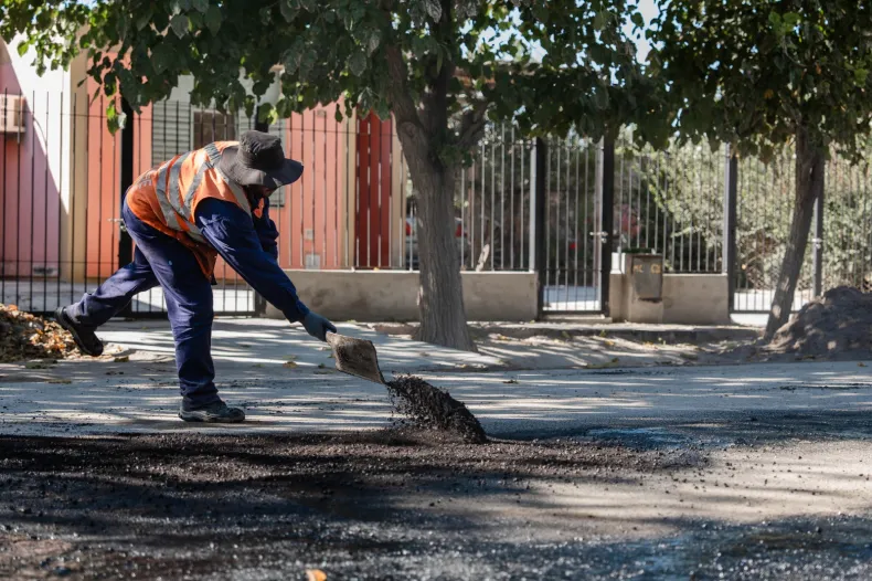 También se realizaron intervenciones en calle del Carril, entre avenida de los Ríos y Galvarini, y continúan las tareas de reacondicionamiento de base en calle Rawson, entre Aberastain y Diagonal Sarmiento. Estas labores, previas a la carpeta asfáltica, incluyen limpieza del sector, riego de liga, colocación de mezcla asfáltica en caliente, compactación y nivelación de la superficie.