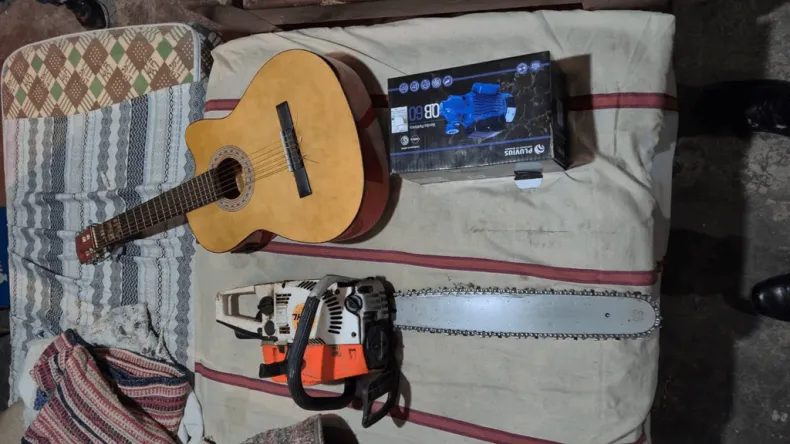 Al arribar al lugar, los efectivos entrevistaron al damnificado, quien indicó que había salido de su domicilio y, al regresar, escuchó ruidos extraños. Según relató, al ingresar constató que una ventana del sector sur había sido forzada y que faltaban una motosierra marca Stihl de color naranja y blanco, una guitarra criolla y una bomba periférica QB60 marca Plubius, de color azul.