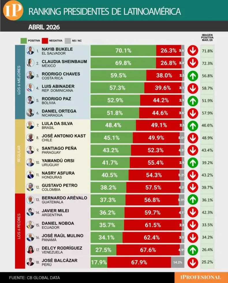 Se trata de un estudio mensual basado en los niveles de imagen positiva y negativa que registra en distintos países de la región sobre los presidentes. En la medición de abril, el listado fue encabezado por Nayib Bukele (El Salvador) y Claudia Sheinbaum (México), mientras que Milei quedó en el puesto número 14.