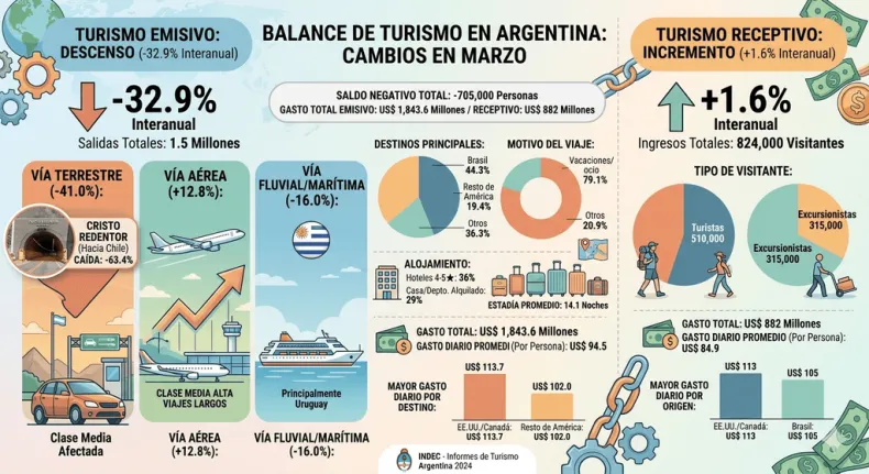 La cantidad de turistas emisivos, es decir los ciudadanos que salieron de las fronteras de la Argentina para vacacionar, tuvo un descenso del 32,9% durante marzo en la comparación interanual. Por otro lado, los visitantes que llegaron desde otros países –turismo receptivo- registraron un incremento del 1,6%. La crisis económica se empieza a sentir en sectores de la clase media que otrora podían agarrar el auto y cruzar alguna de las fronteras habilitadas por vía terrestre. Durante el tercer mes del año, el turismo emisivo por tierra tuvo un descenso interanual del 41%, con especial incidencia en el cruce del Cristo Redentor.