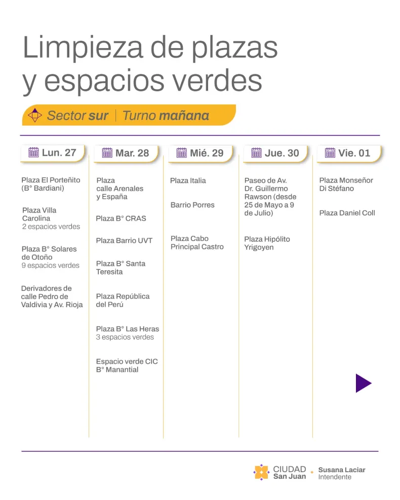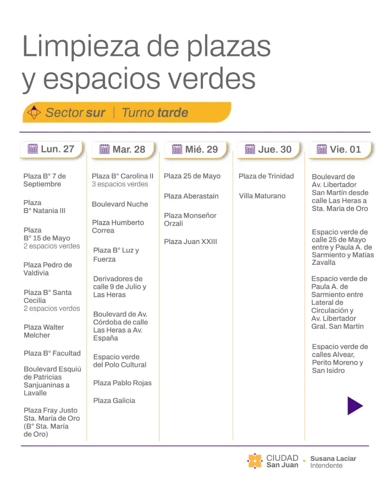 La Municipalidad de la Ciudad de San Juan informa el cronograma de limpieza y mantenimiento de plazas y espacios verdes que se desarrollará desde el lunes 27 de abril al viernes 1 de mayo, con intervenciones simultáneas en los sectores noroeste (turno mañana) y sur (turno tarde).