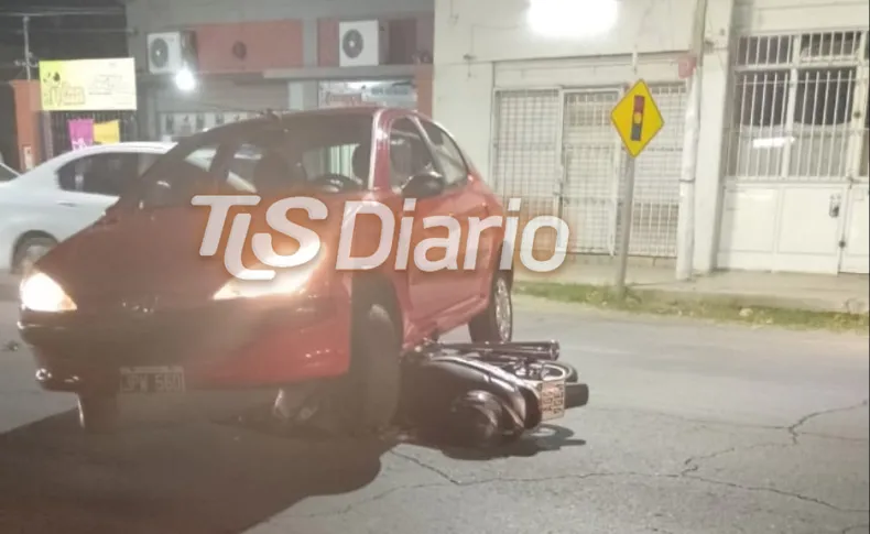 Tras el choque, el auto quedó con su parte delantera derecha apoyada sobre la estructura de la moto, que terminó debajo del chasis. En el lugar se observaron daños visibles en el guardabarros y la óptica del vehículo, mientras la rueda delantera del rodado menor quedó comprimida bajo la carrocería.