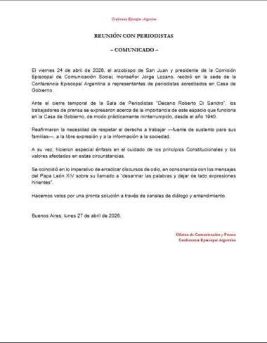 En el pronunciamiento difundido después del encuentro, la Iglesia recogió esos planteos y remarcó la necesidad de resguardar esos principios en el contexto actual. Los trabajadores recordaron además que la sala funcionaba de manera casi ininterrumpida desde la década de 1940, con un rol central en la cobertura cotidiana de la actividad gubernamental.