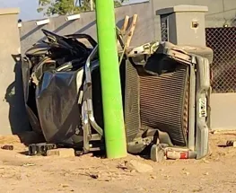 El vehículo quedó volcado contra la entrada a una casa. Los tres ocupantes resultaron ilesos a pesar de que el rodado quedó destruído.