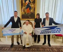 El Papa Francisco se muestra con una bandera de Aerolíneas Argentinas que llevaron los integrantes de la Asociación Argentina de Aeronavegantes.