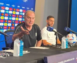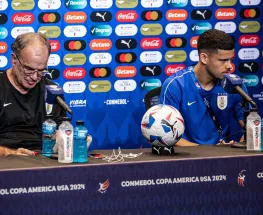 El Loco Marcelo Bielsa asistió a la rueda de prensa previa a la semifinal en compañía de Maxi Araújo, uno de los habituales titulares de la selección urguaya.