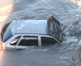 Auto cae a un canal tras ser impactado por una camioneta. La conductora del vehículo salió por sus propios medios.